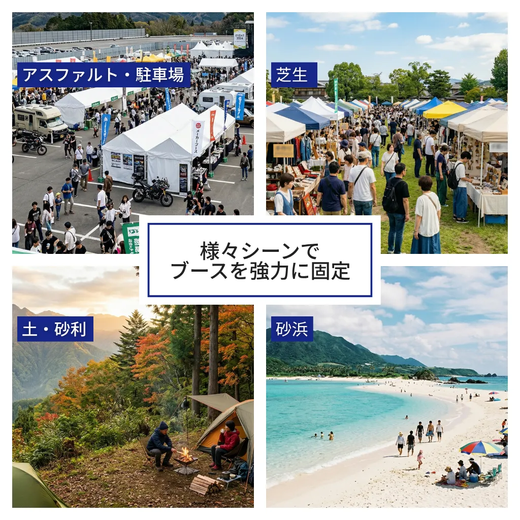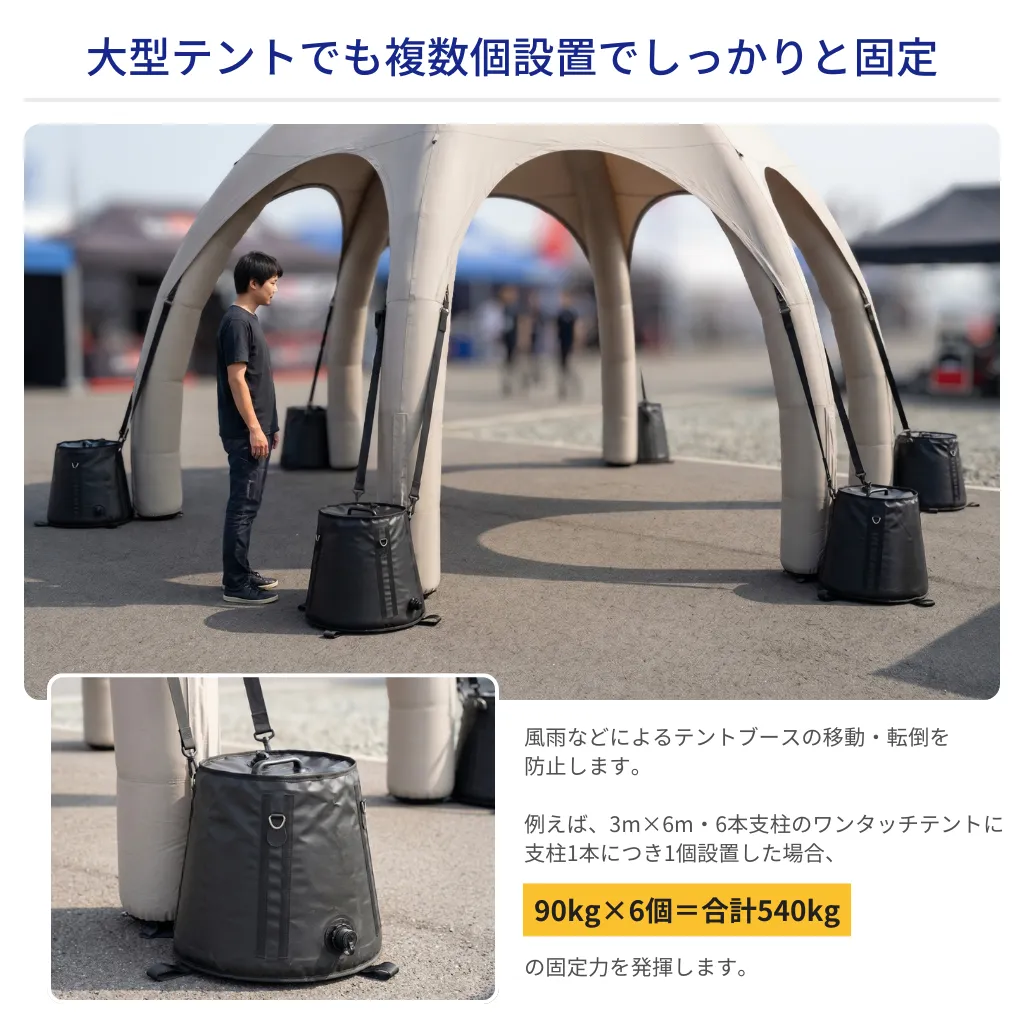 最大クラスの固定力で、大型イベントや強風環境でも安心してご使用いただけます。移動の際は必ず複数人で作業してください。