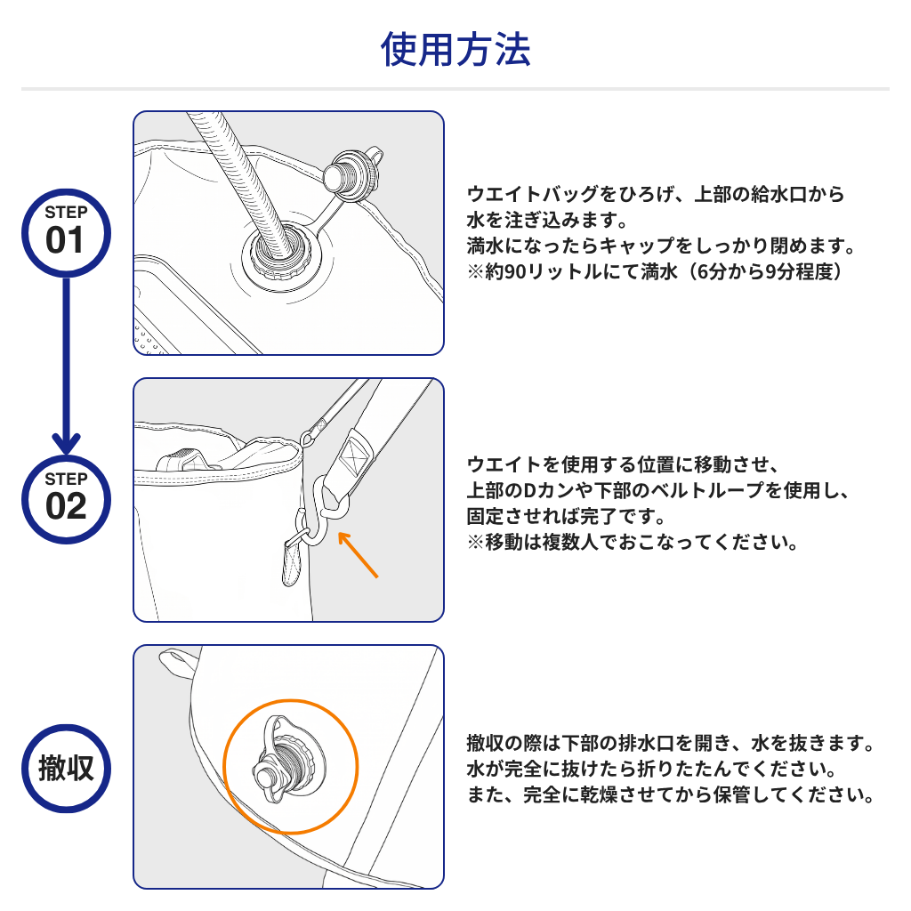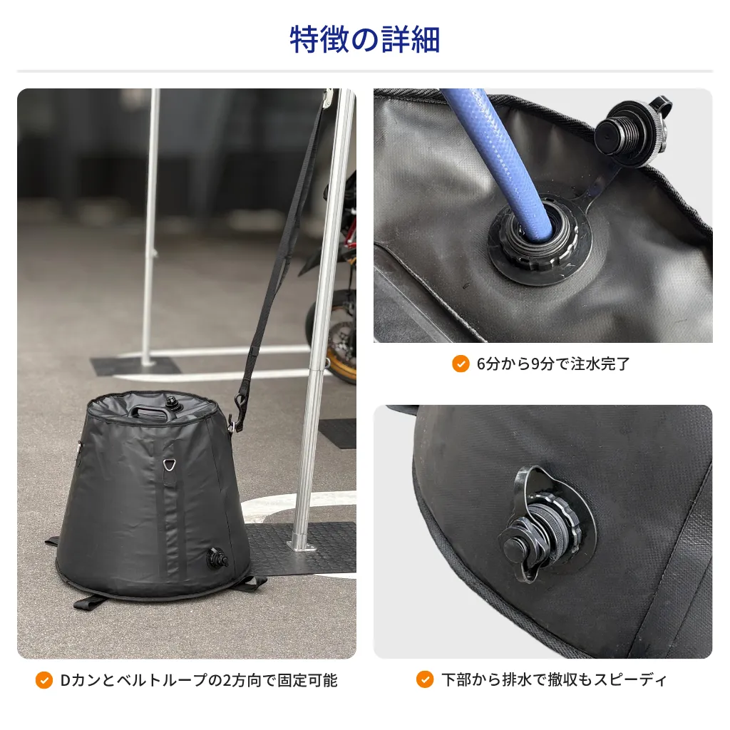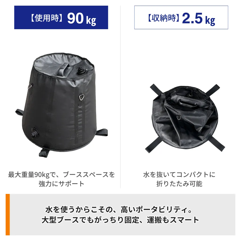 水を注入することによって使用できる注水式。満水時で約90kg。一般的な水道で、6分から9分程度で満水にすることができます。