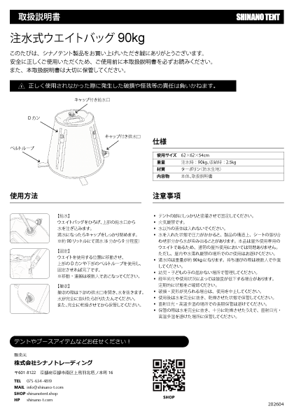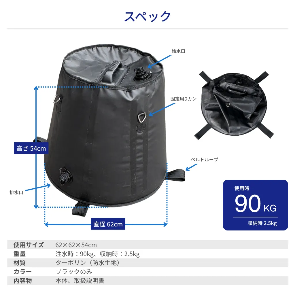 | 重量(kg) | 【注水時】90、【収納時】2.5 |